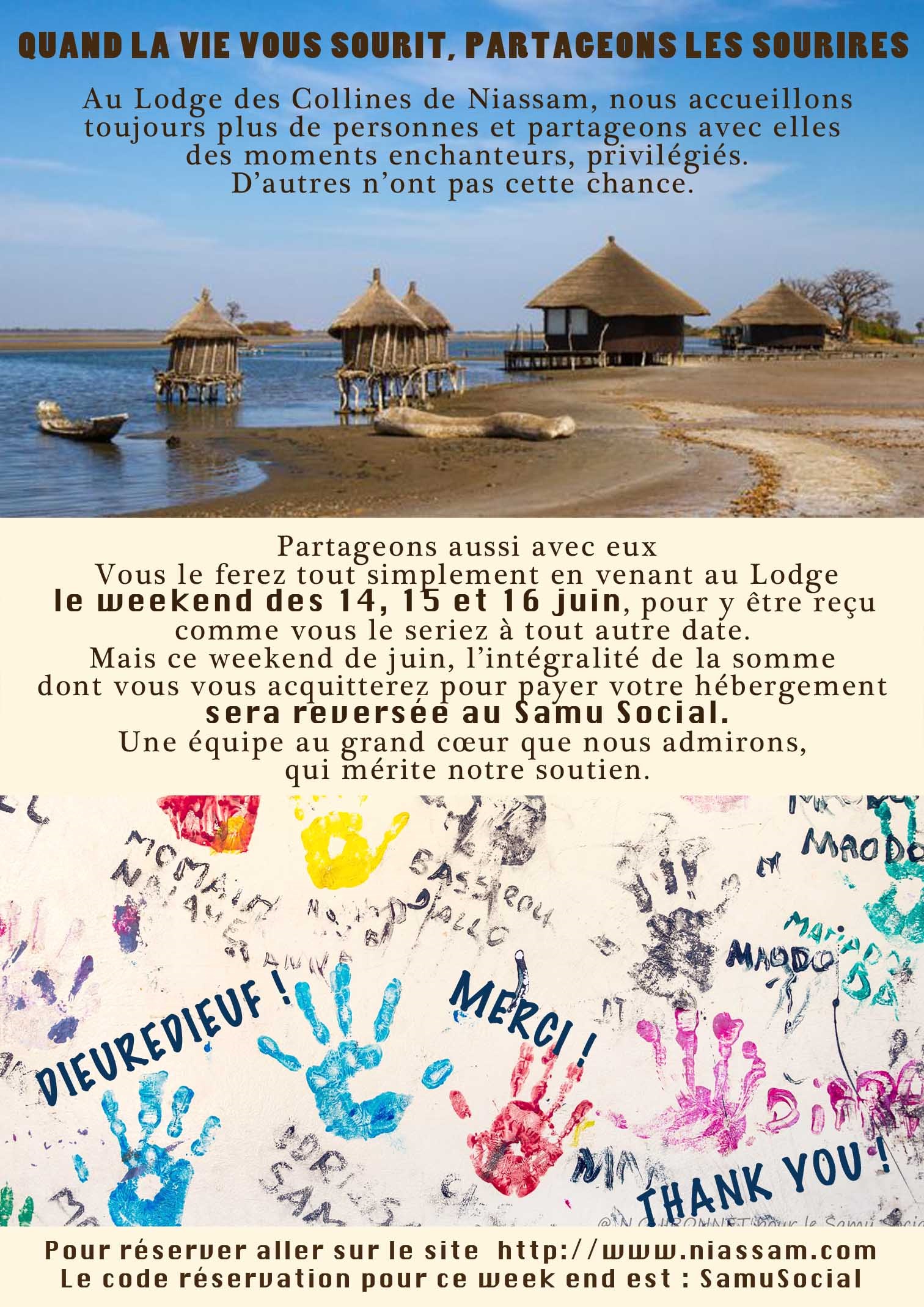 Aujourd’hui, le Lodge des Collines de Niassam, situé dans un site enchanteur du Sine Saloum, propose de soutenir les enfants des rues en offrant la recette d’hébergement des 14, 15 et 16 juin au Samu Social Sénégal. Profitez d’un séjour de rêve tout en faisant une belle action !